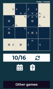 At the start of the game you will see squares in two colours. The goal is to darken them all. Tap a square to change the colour of the adjacent ones indicated by the arrows, and the tapped square itself will also change if it has a small dot in the centre.